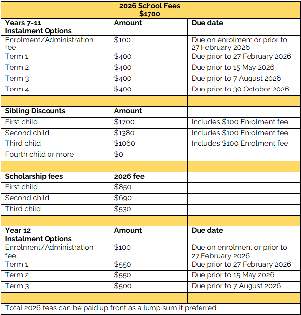 Scholarships are available to families who are experiencing financial hardship and we encourage all parents/carers to apply for scholarships if they are struggling to pay school fees. Information regarding school fees, payment plans, and scholarships are available here.