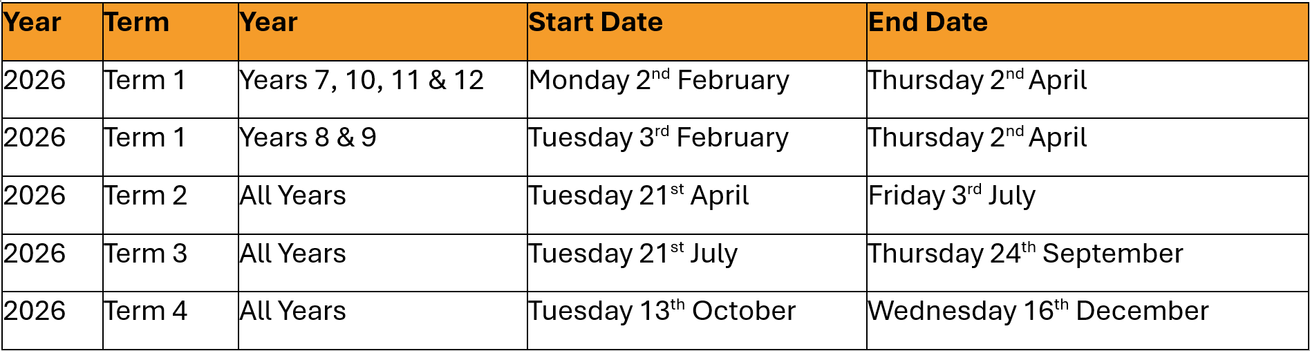 The first day of Term 1 for students in Years 7, 10, 11 & 12 is Monday, 2nd February 2026.