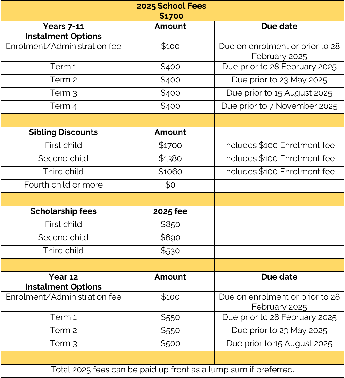 Scholarships are available to families who are experiencing financial hardship and we encourage all parents/carers to apply for scholarships if they are struggling to pay school fees. Information regarding school fees, payment plans, and scholarships are available on the College website.