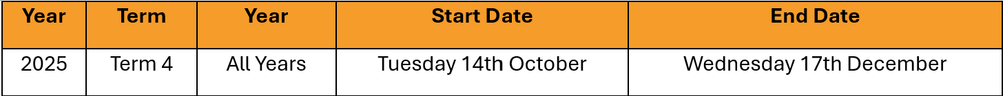 The first day of Term 4 for all students is Tuesday, 14th October 2025